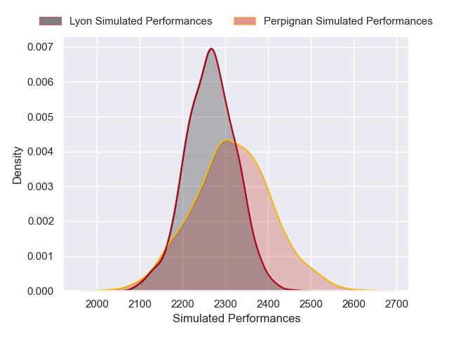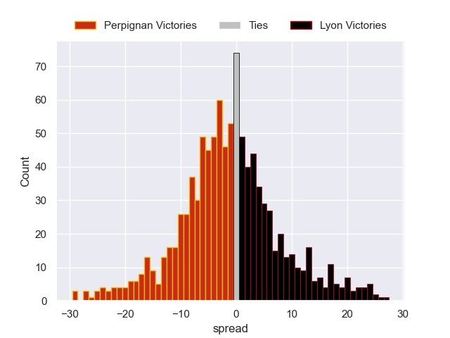Each club has a rating and a rating deviation (similar to a Glicko rating), and expected performances can be generated. This allows for simulated matches and spreads like the ones below.