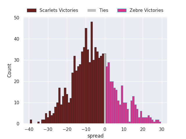 Each club has a rating and a rating deviation (similar to a Glicko rating), and expected performances can be generated. This allows for simulated matches and spreads like the ones below.