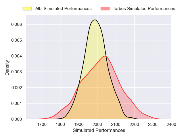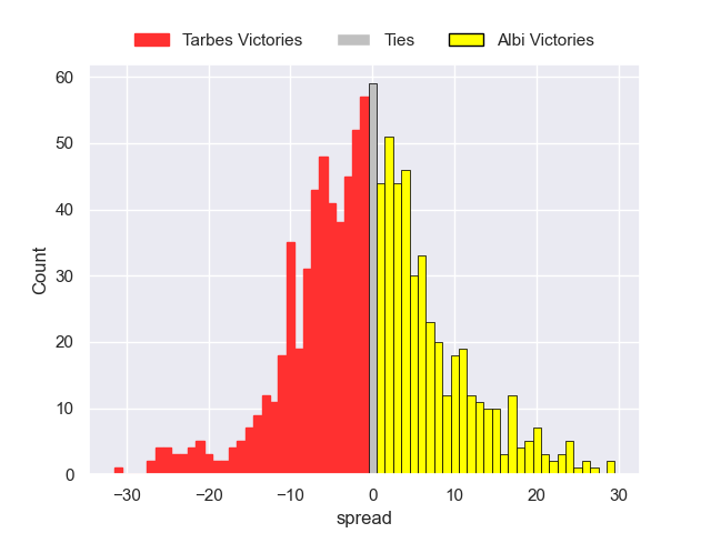 Each club has a rating and a rating deviation (similar to a Glicko rating), and expected performances can be generated. This allows for simulated matches and spreads like the ones below.