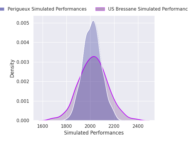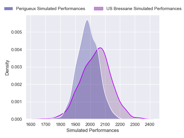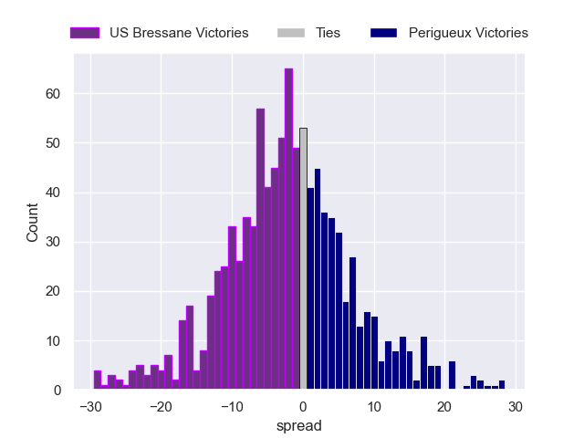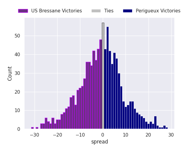 Each club has a rating and a rating deviation (similar to a Glicko rating), and expected performances can be generated. This allows for simulated matches and spreads like the ones below.