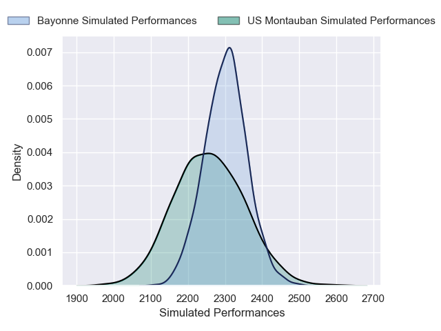 Each club has a rating and a rating deviation (similar to a Glicko rating), and expected performances can be generated. This allows for simulated matches and spreads like the ones below.