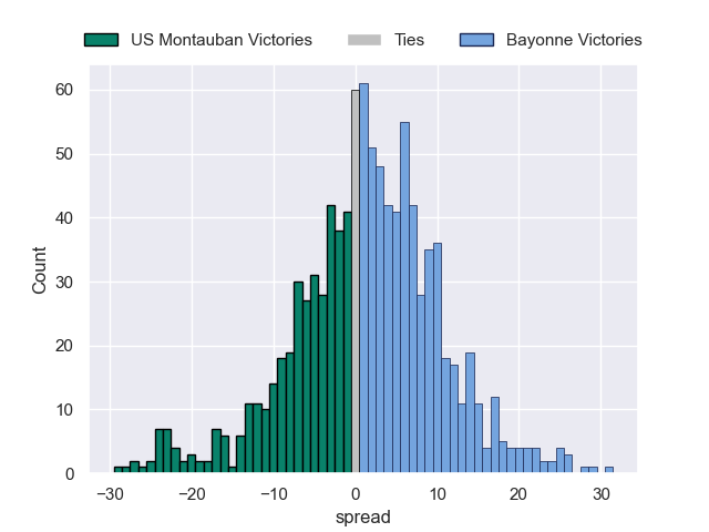 The first set of predictions treats a club as the smallest object, as the club develops its members, organizes a gameplan, and deploys its players as needed for each match. This club model is currently predicting Bayonne to win by 1.41.