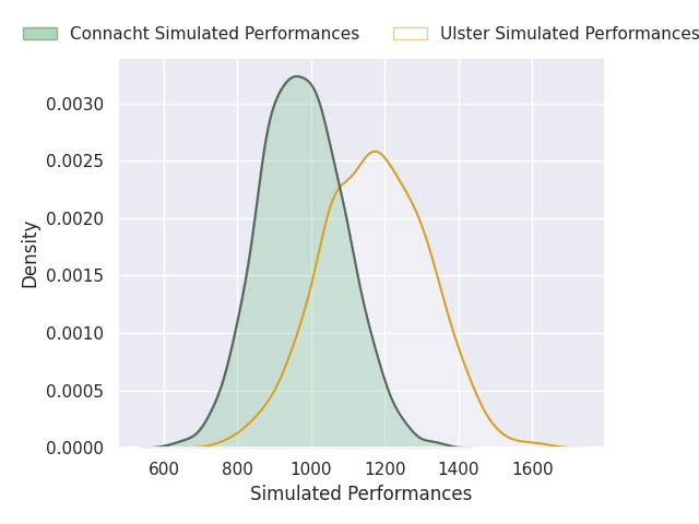 Each club has a rating and a rating deviation (similar to a Glicko rating), and expected performances can be generated. This allows for simulated matches and spreads like the ones below.