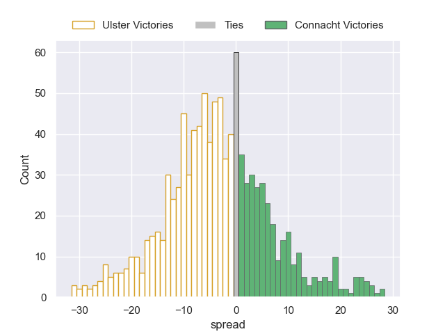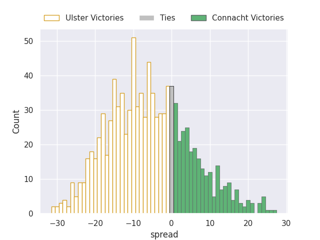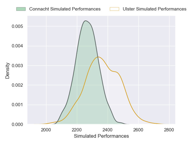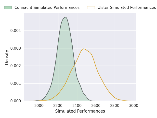 Each club has a rating and a rating deviation (similar to a Glicko rating), and expected performances can be generated. This allows for simulated matches and spreads like the ones below.