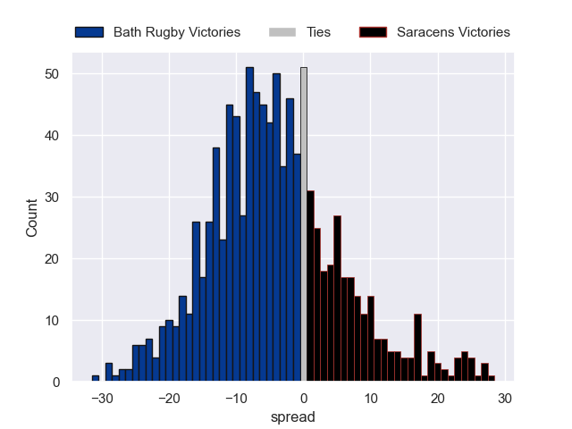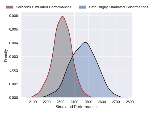 Each club has a rating and a rating deviation (similar to a Glicko rating), and expected performances can be generated. This allows for simulated matches and spreads like the ones below.