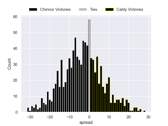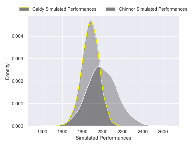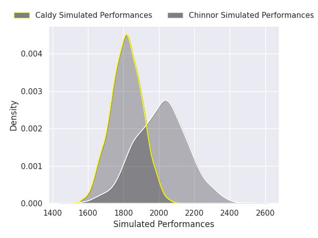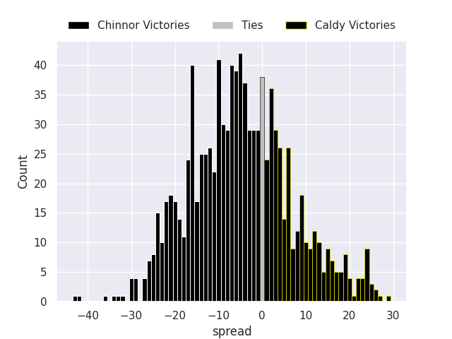 Each club has a rating and a rating deviation (similar to a Glicko rating), and expected performances can be generated. This allows for simulated matches and spreads like the ones below.