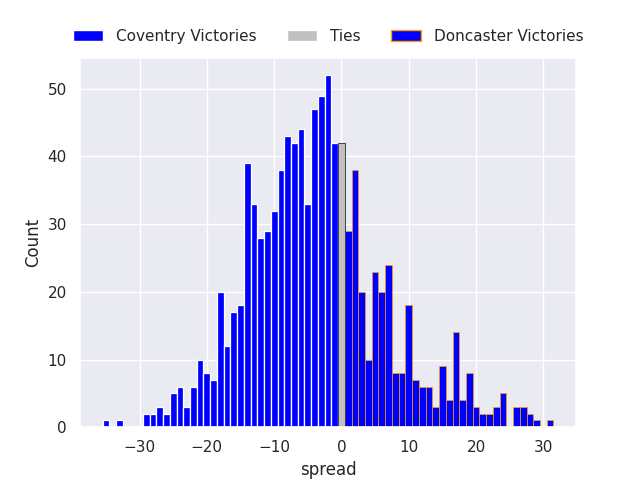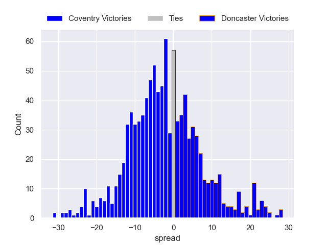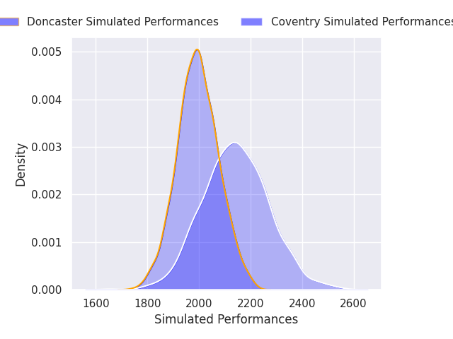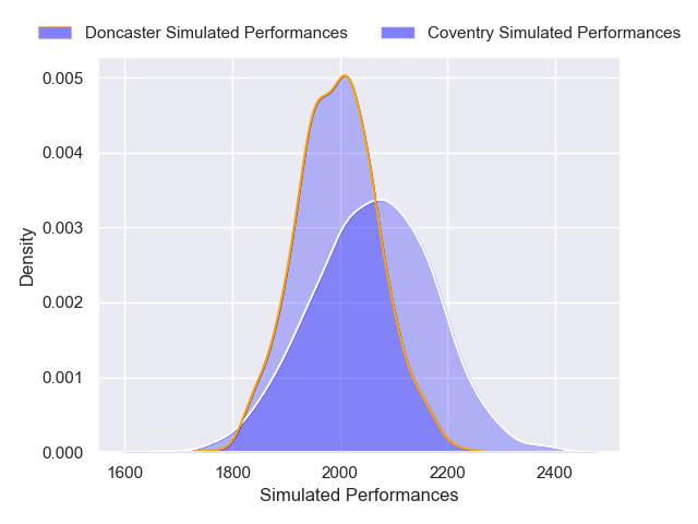 Each club has a rating and a rating deviation (similar to a Glicko rating), and expected performances can be generated. This allows for simulated matches and spreads like the ones below.