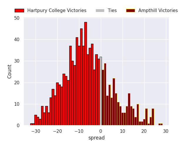 Each club has a rating and a rating deviation (similar to a Glicko rating), and expected performances can be generated. This allows for simulated matches and spreads like the ones below.