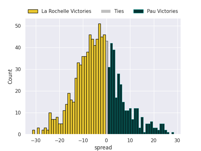 The first set of predictions treats a club as the smallest object, as the club develops its members, organizes a gameplan, and deploys its players as needed for each match. This club model is currently predicting La Rochelle to win by 3.43.