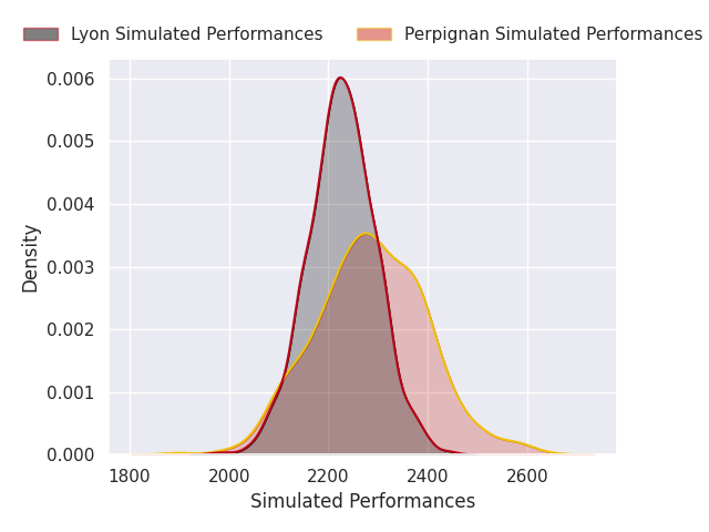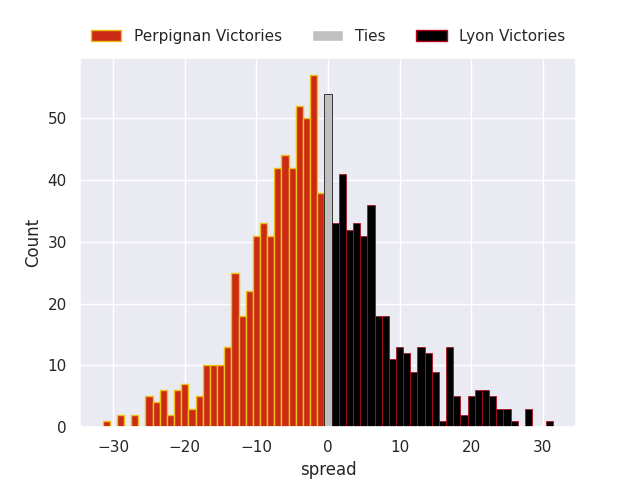 Each club has a rating and a rating deviation (similar to a Glicko rating), and expected performances can be generated. This allows for simulated matches and spreads like the ones below.