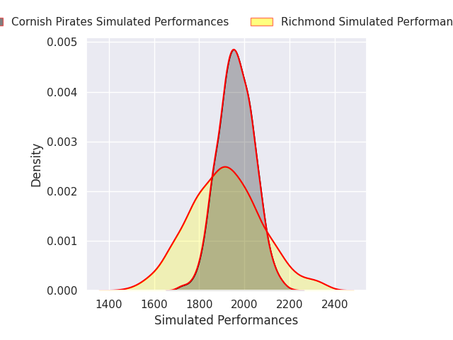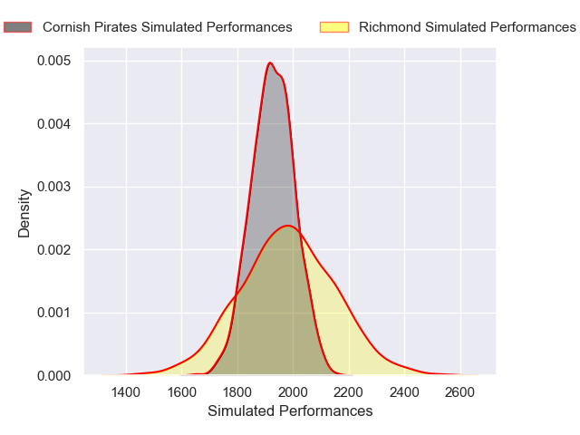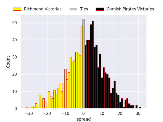 Each club has a rating and a rating deviation (similar to a Glicko rating), and expected performances can be generated. This allows for simulated matches and spreads like the ones below.
