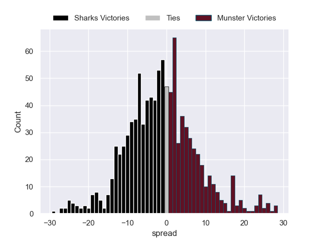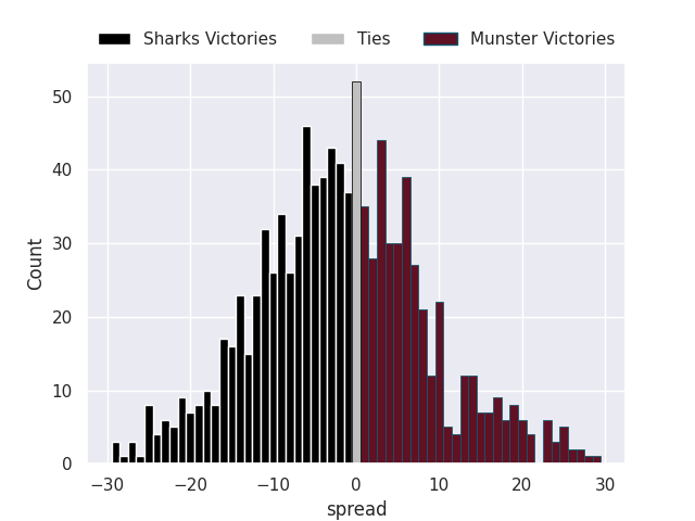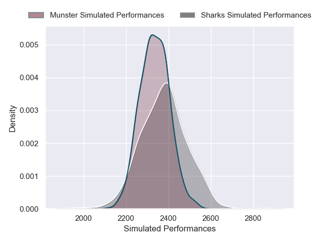 Each club has a rating and a rating deviation (similar to a Glicko rating), and expected performances can be generated. This allows for simulated matches and spreads like the ones below.