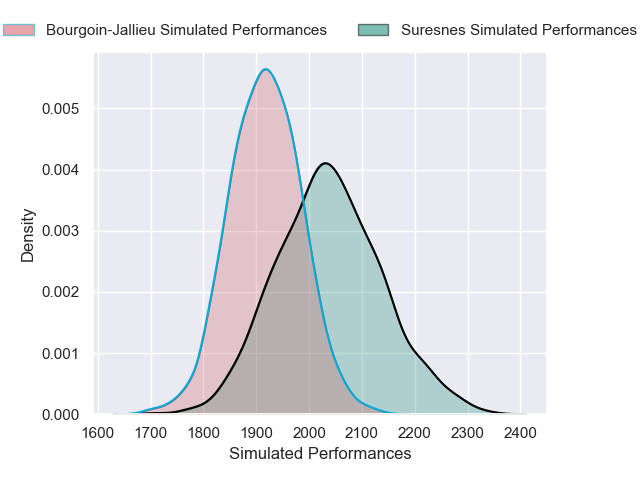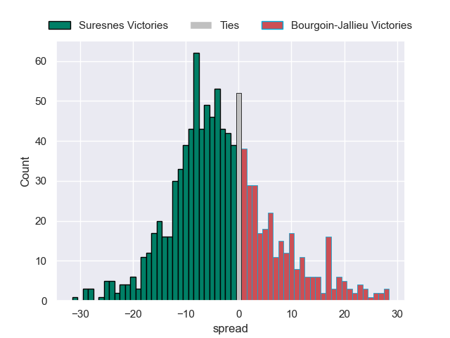 Each club has a rating and a rating deviation (similar to a Glicko rating), and expected performances can be generated. This allows for simulated matches and spreads like the ones below.