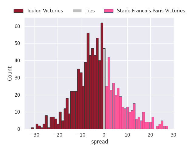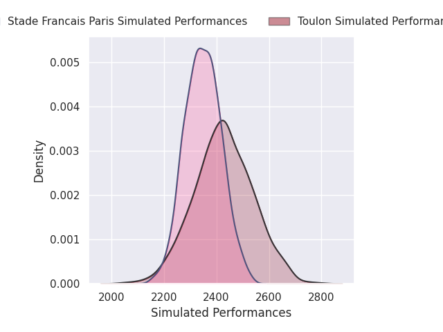 Each club has a rating and a rating deviation (similar to a Glicko rating), and expected performances can be generated. This allows for simulated matches and spreads like the ones below.