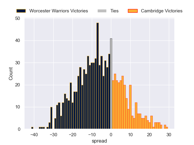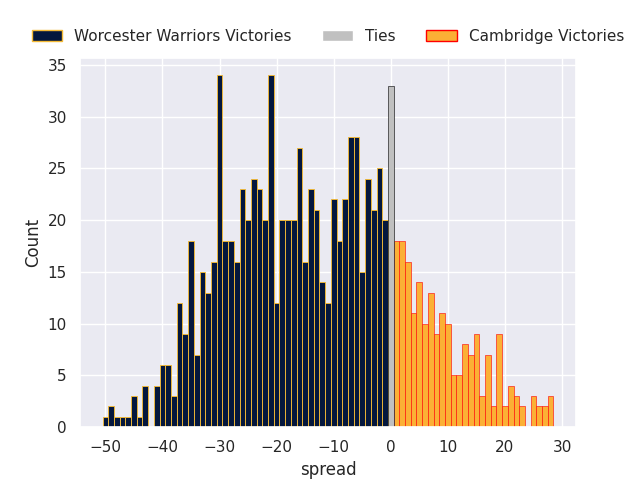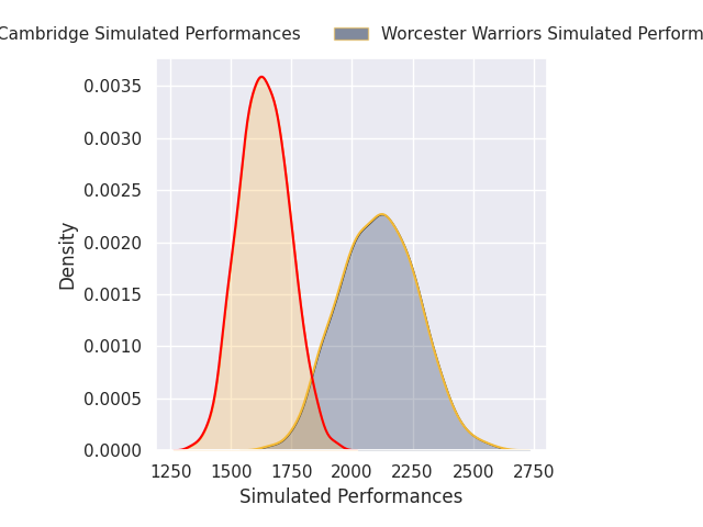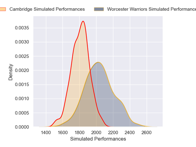 Each club has a rating and a rating deviation (similar to a Glicko rating), and expected performances can be generated. This allows for simulated matches and spreads like the ones below.