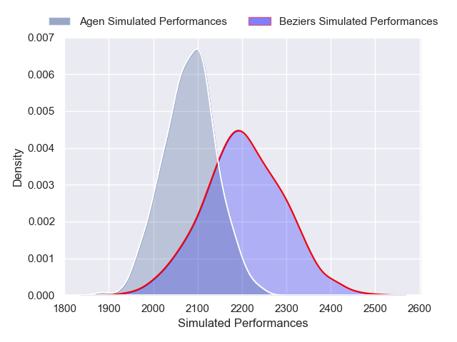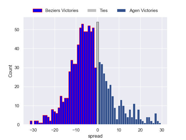 Each club has a rating and a rating deviation (similar to a Glicko rating), and expected performances can be generated. This allows for simulated matches and spreads like the ones below.