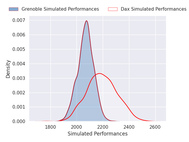 Each club has a rating and a rating deviation (similar to a Glicko rating), and expected performances can be generated. This allows for simulated matches and spreads like the ones below.