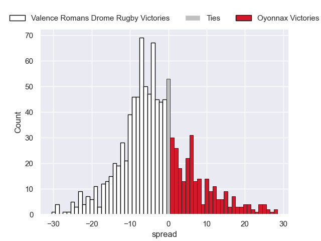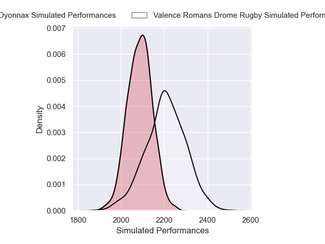 Each club has a rating and a rating deviation (similar to a Glicko rating), and expected performances can be generated. This allows for simulated matches and spreads like the ones below.