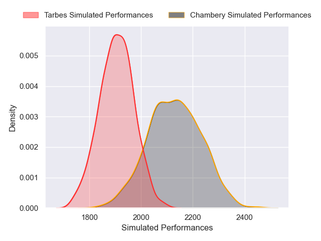 Each club has a rating and a rating deviation (similar to a Glicko rating), and expected performances can be generated. This allows for simulated matches and spreads like the ones below.