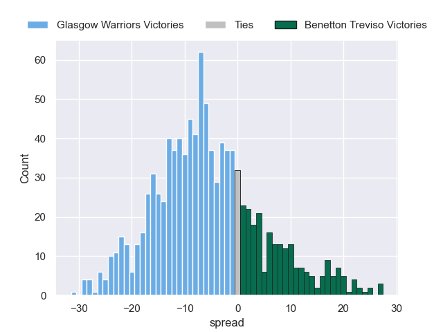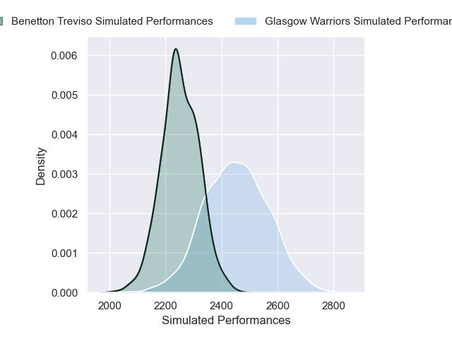 Each club has a rating and a rating deviation (similar to a Glicko rating), and expected performances can be generated. This allows for simulated matches and spreads like the ones below.