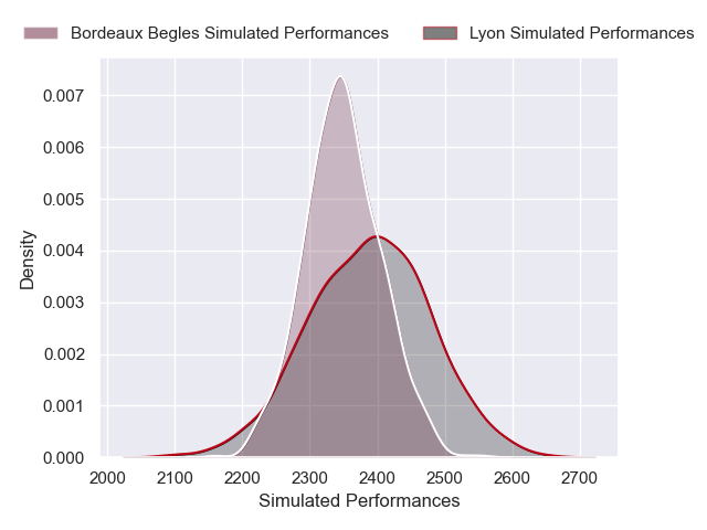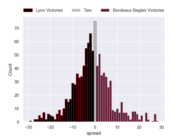 Each club has a rating and a rating deviation (similar to a Glicko rating), and expected performances can be generated. This allows for simulated matches and spreads like the ones below.