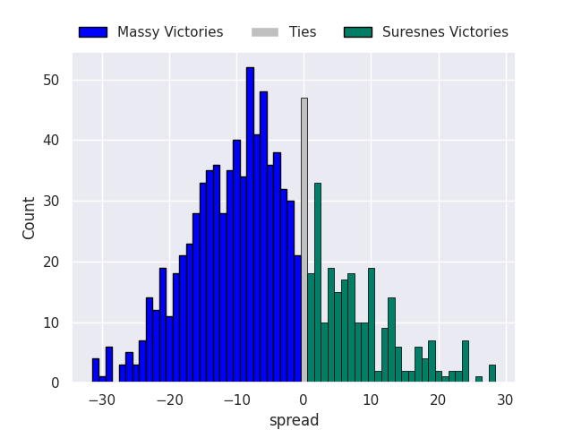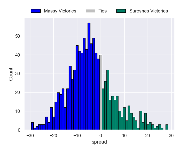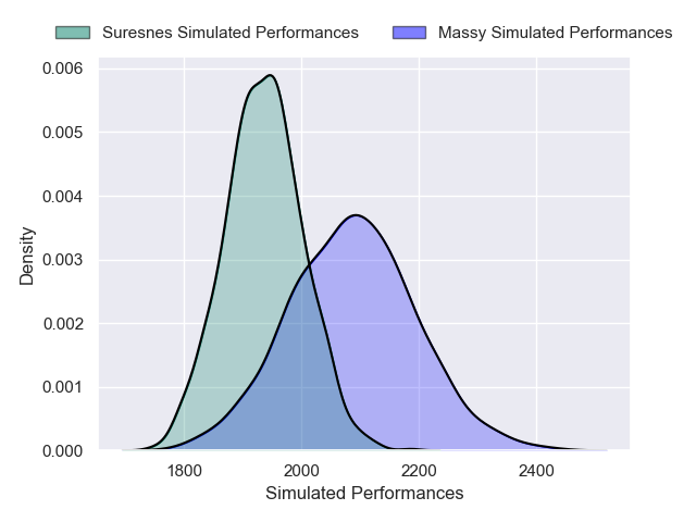 Each club has a rating and a rating deviation (similar to a Glicko rating), and expected performances can be generated. This allows for simulated matches and spreads like the ones below.