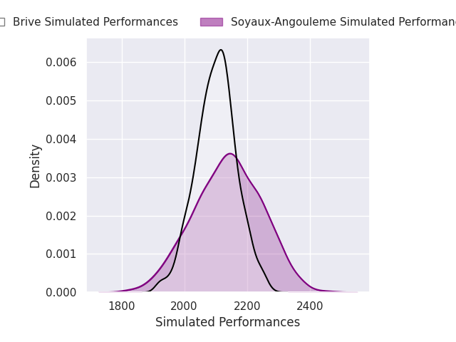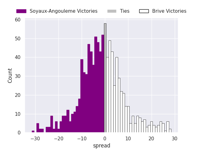 Each club has a rating and a rating deviation (similar to a Glicko rating), and expected performances can be generated. This allows for simulated matches and spreads like the ones below.