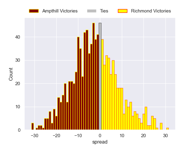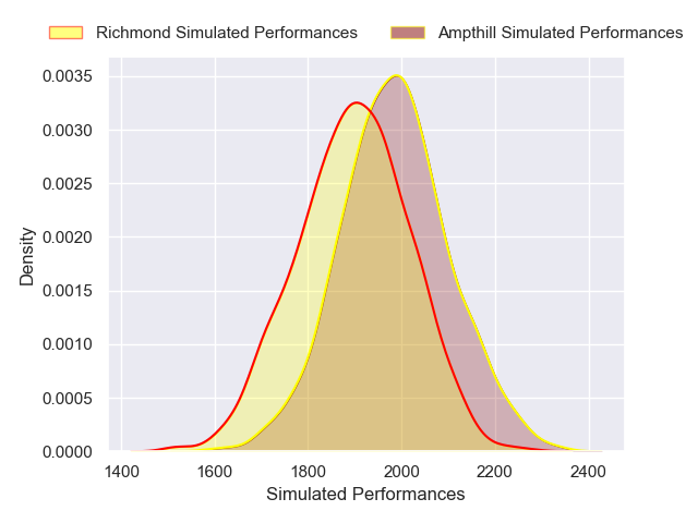 Each club has a rating and a rating deviation (similar to a Glicko rating), and expected performances can be generated. This allows for simulated matches and spreads like the ones below.