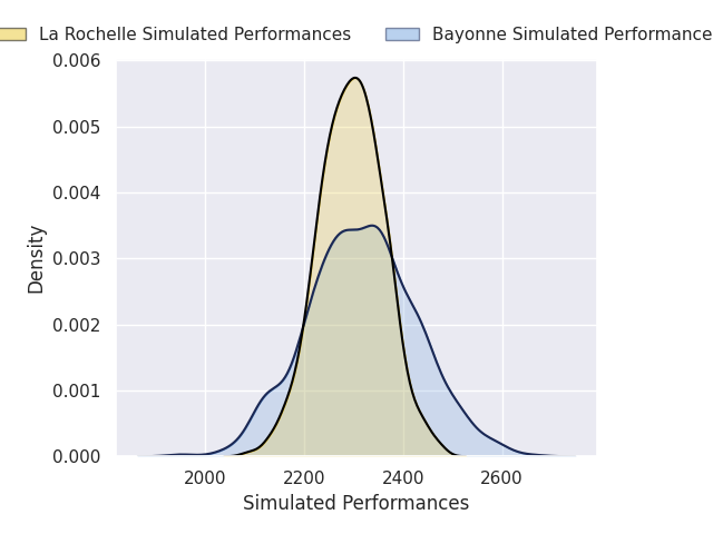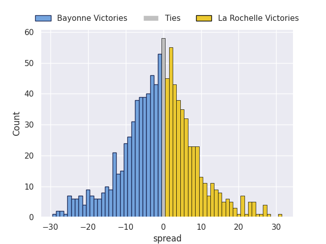 Each club has a rating and a rating deviation (similar to a Glicko rating), and expected performances can be generated. This allows for simulated matches and spreads like the ones below.