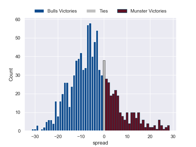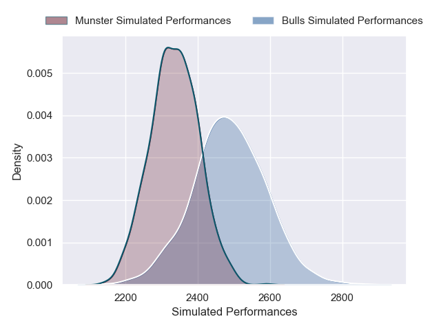 Each club has a rating and a rating deviation (similar to a Glicko rating), and expected performances can be generated. This allows for simulated matches and spreads like the ones below.