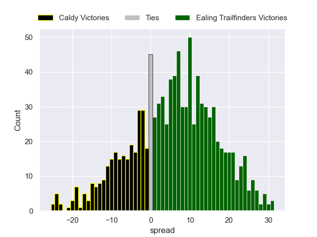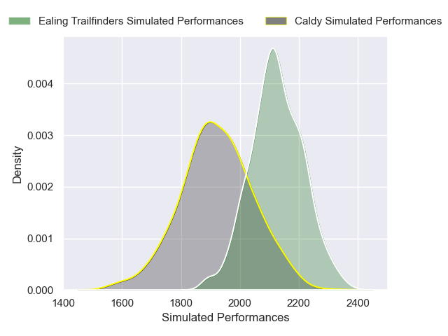 Each club has a rating and a rating deviation (similar to a Glicko rating), and expected performances can be generated. This allows for simulated matches and spreads like the ones below.