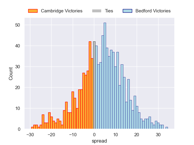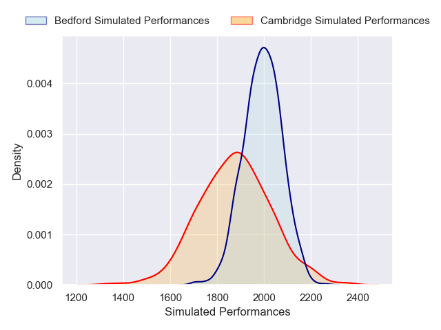 Each club has a rating and a rating deviation (similar to a Glicko rating), and expected performances can be generated. This allows for simulated matches and spreads like the ones below.