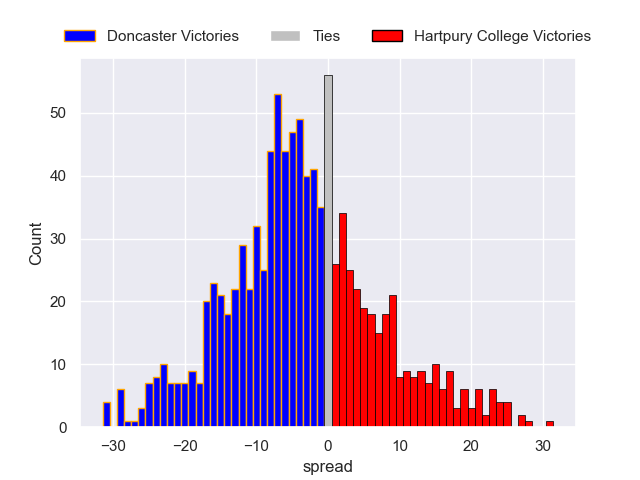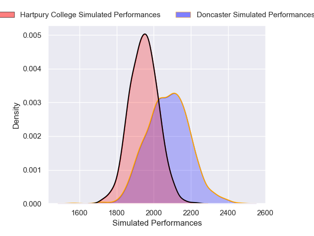 Each club has a rating and a rating deviation (similar to a Glicko rating), and expected performances can be generated. This allows for simulated matches and spreads like the ones below.