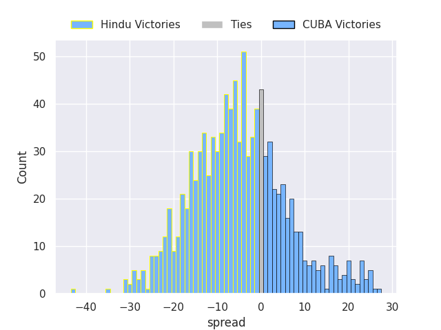 The first set of predictions treats a club as the smallest object, as the club develops its members, organizes a gameplan, and deploys its players as needed for each match. This club model is currently predicting Hindu to win by 5.14.
