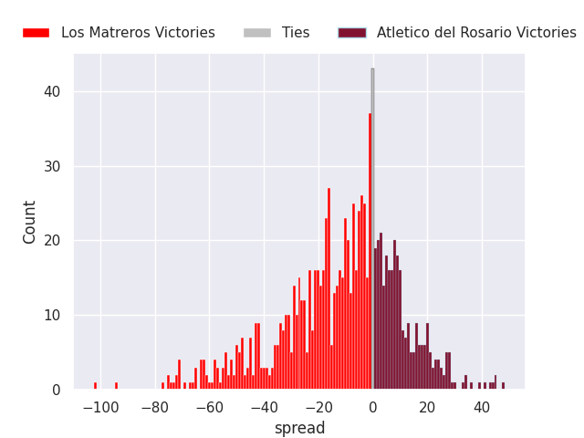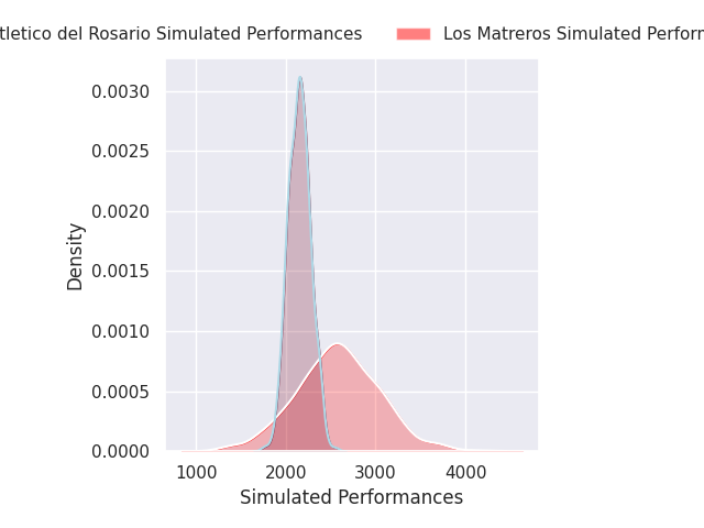 Each club has a rating and a rating deviation (similar to a Glicko rating), and expected performances can be generated. This allows for simulated matches and spreads like the ones below.