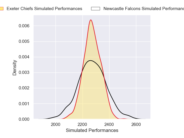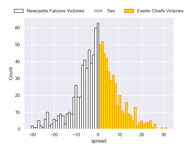 Each club has a rating and a rating deviation (similar to a Glicko rating), and expected performances can be generated. This allows for simulated matches and spreads like the ones below.