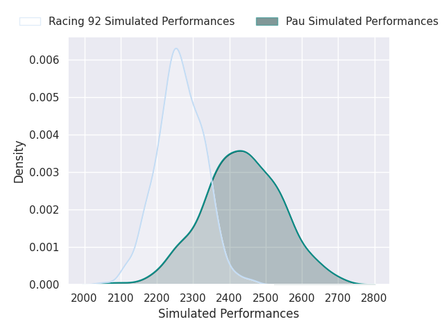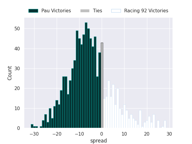 Each club has a rating and a rating deviation (similar to a Glicko rating), and expected performances can be generated. This allows for simulated matches and spreads like the ones below.