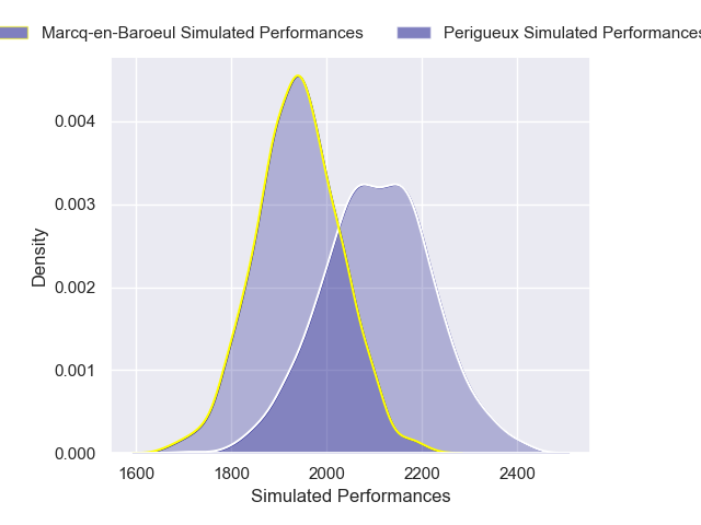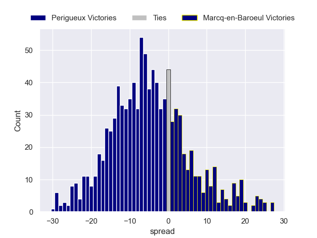 Each club has a rating and a rating deviation (similar to a Glicko rating), and expected performances can be generated. This allows for simulated matches and spreads like the ones below.