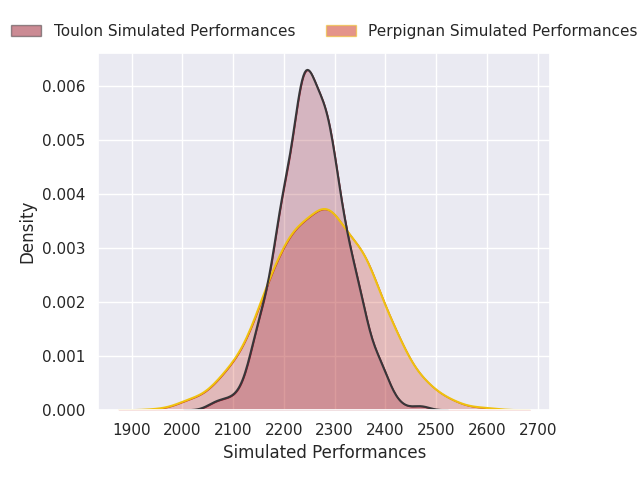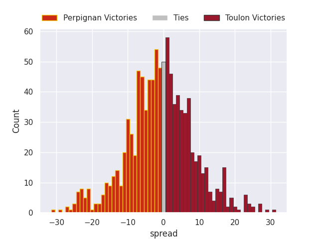 Each club has a rating and a rating deviation (similar to a Glicko rating), and expected performances can be generated. This allows for simulated matches and spreads like the ones below.