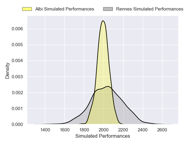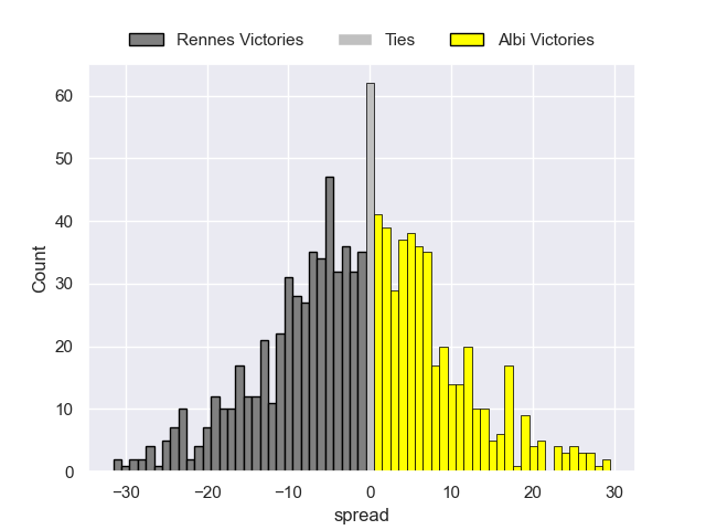 Each club has a rating and a rating deviation (similar to a Glicko rating), and expected performances can be generated. This allows for simulated matches and spreads like the ones below.