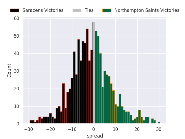 Each club has a rating and a rating deviation (similar to a Glicko rating), and expected performances can be generated. This allows for simulated matches and spreads like the ones below.