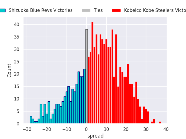 The first set of predictions treats a club as the smallest object, as the club develops its members, organizes a gameplan, and deploys its players as needed for each match. This club model is currently predicting Kobelco Kobe Steelers to win by 6.24.