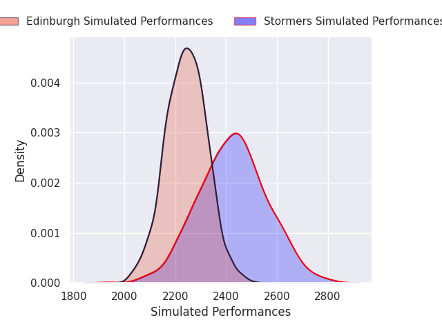 Each club has a rating and a rating deviation (similar to a Glicko rating), and expected performances can be generated. This allows for simulated matches and spreads like the ones below.