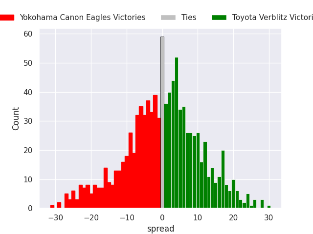 Each club has a rating and a rating deviation (similar to a Glicko rating), and expected performances can be generated. This allows for simulated matches and spreads like the ones below.