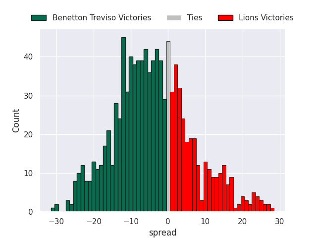 Each club has a rating and a rating deviation (similar to a Glicko rating), and expected performances can be generated. This allows for simulated matches and spreads like the ones below.