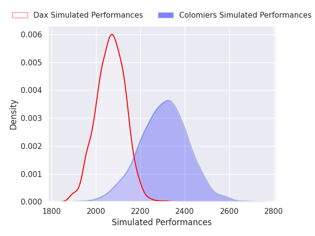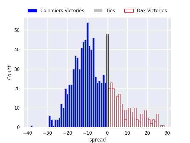 Each club has a rating and a rating deviation (similar to a Glicko rating), and expected performances can be generated. This allows for simulated matches and spreads like the ones below.