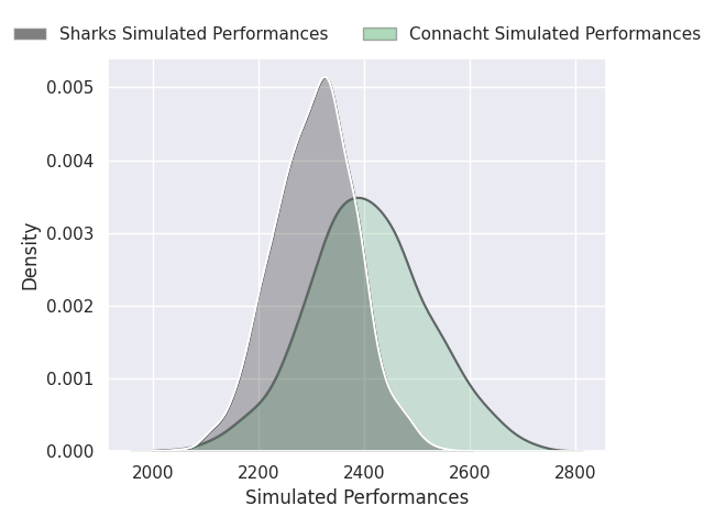 Each club has a rating and a rating deviation (similar to a Glicko rating), and expected performances can be generated. This allows for simulated matches and spreads like the ones below.