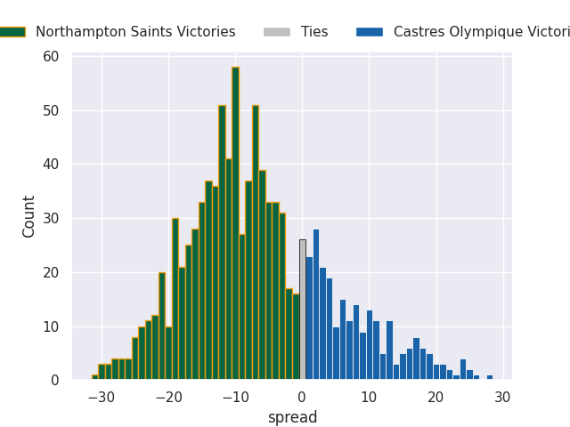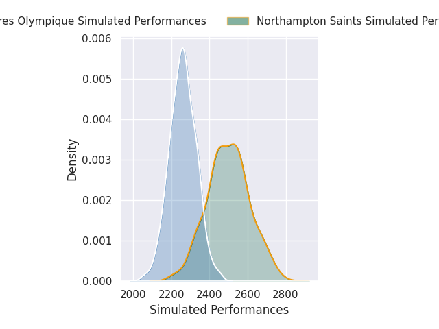 Each club has a rating and a rating deviation (similar to a Glicko rating), and expected performances can be generated. This allows for simulated matches and spreads like the ones below.
