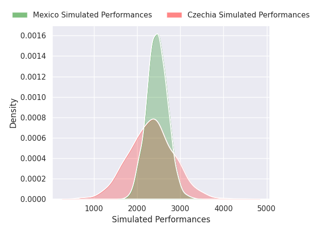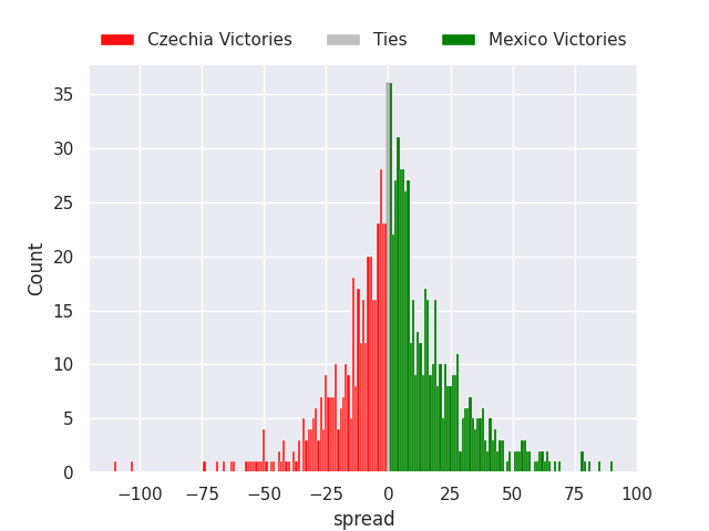 Each club has a rating and a rating deviation (similar to a Glicko rating), and expected performances can be generated. This allows for simulated matches and spreads like the ones below.