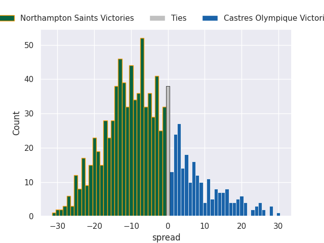 Each club has a rating and a rating deviation (similar to a Glicko rating), and expected performances can be generated. This allows for simulated matches and spreads like the ones below.
